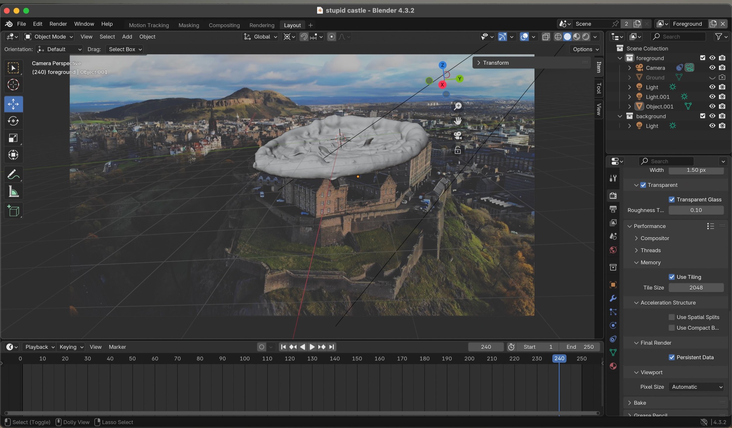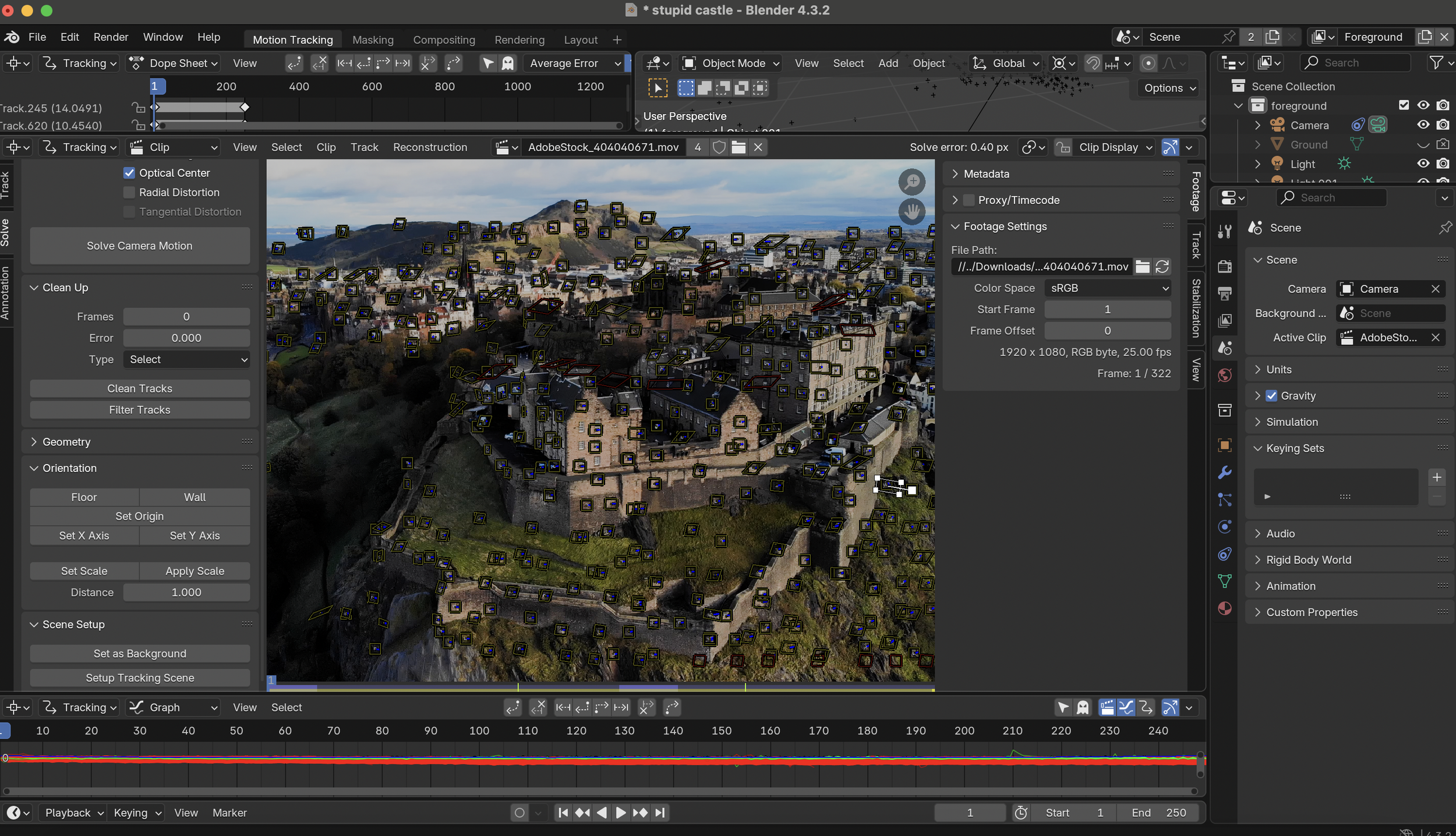 Drone footage of Edinburgh castle was imported into blender and motion tracking markers were created for the full length of the footage.